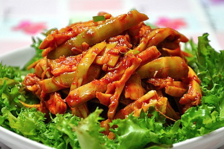 - 재료: 신선한 죽순, 간장, 설탕, 참기름, 다진 마늘, 다진 파, 고춧가루