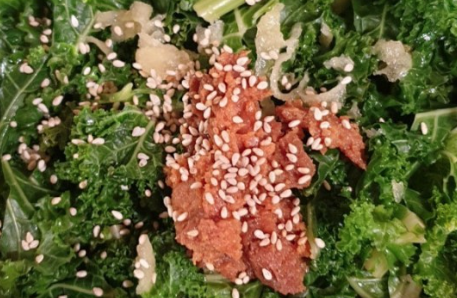 - 올리브 오일과 레몬 주스, 소금, 후추로 간을 낸 드레싱을 만들어 케일에 골고루 섞어주세요.